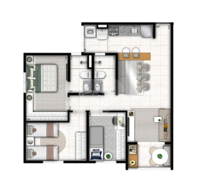 Apartamento de 68m² (planta de 3 dormitórios), conta com: