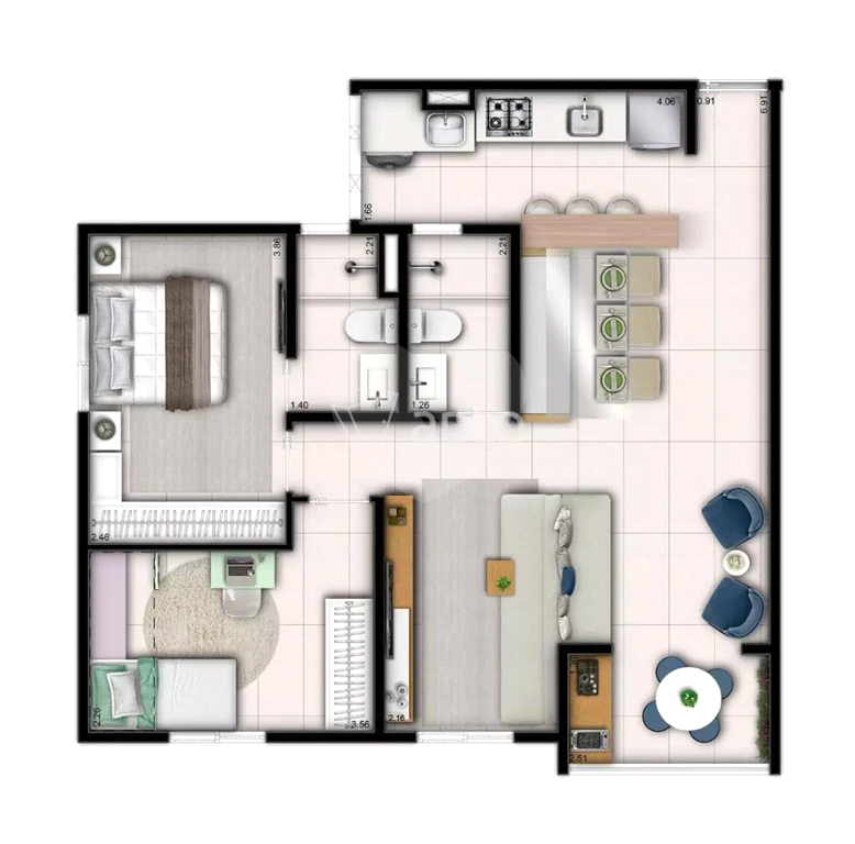 2 Dormitórios sendo 1 suíte