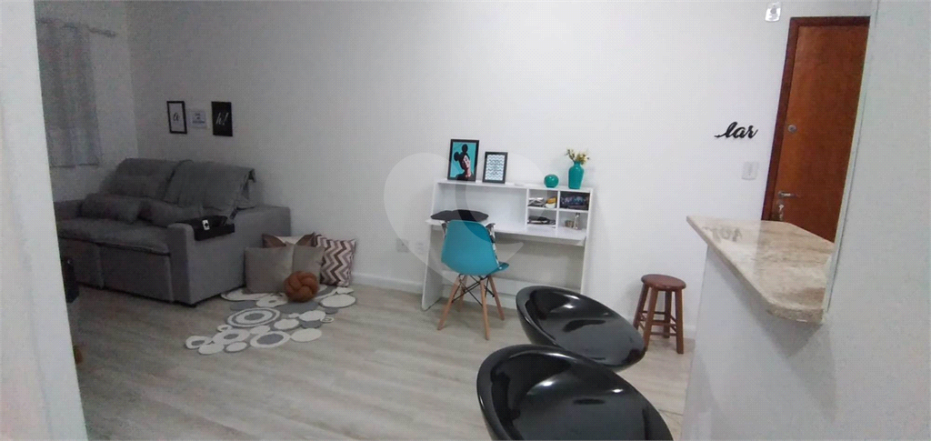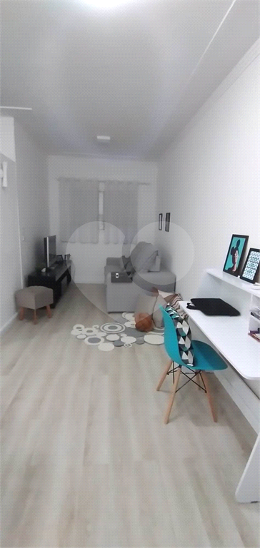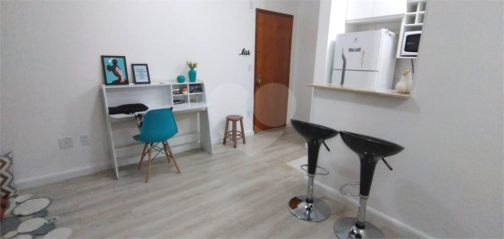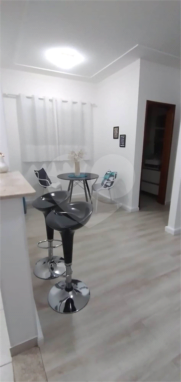 1 Dormitório. 1 Banheiro social com gabinete e box de vidro. Sala de estar. Cozinha com armários embutidos e gabinete. Área de serviço. 1 Vaga de garagem.